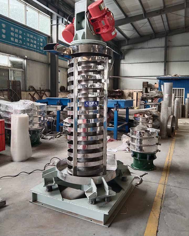DZC系列垂直振動提升機的驅動裝置振動電機安裝在輸送塔下部,兩臺振動電機對稱交叉安裝,輸送塔由管體和焊接在管體周圍的螺旋輸送槽組成,輸送塔座于減振裝置上,減振裝置由底座和隔振彈簧組成。當垂直輸送機工作時,根據雙振動電機自同步原理,由振動電機產生激振力,強迫整個輸送塔體作水平圓運動和向上垂直運動的空間復合振動,螺旋槽內的物料則受輸送槽的作用,作勻速拋擲圓運動,沿輸送槽體向上運動,從而完成物料的向上(或向下)輸送作業。