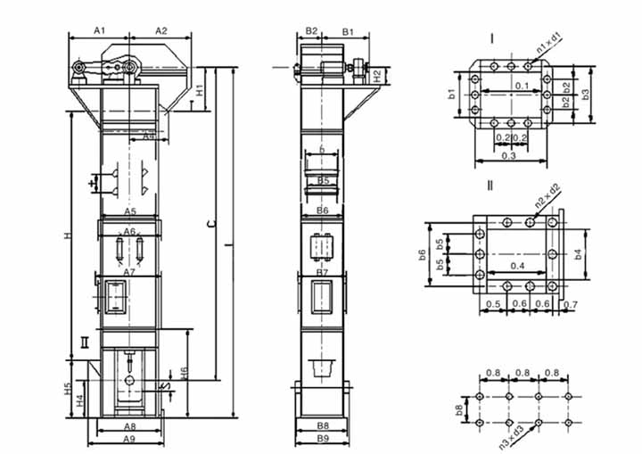 垂直斗式提升機由頭部驅動組件、中部機殼、底部張緊結構、料斗與牽引構件組成,各部件配合決定可實現的提升高度。牽引構件包含橡膠膠帶、圓環鏈與板式鏈。鏈條類構件承載能力更強,板鏈適配重載與高磨損場景,高度延伸時仍能保持傳動穩定。中部機殼由多節標準段拼接,底部張緊裝置可自動補償牽引件伸長量,保障運行時料斗位置不偏移。下面是結構示意圖。