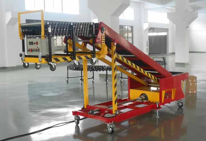 伸縮皮帶機是由撓性輸送帶作為物料承載件的連續輸送設備,根據摩擦傳動原理,由傳動滾筒帶動輸送帶,輸送帶回繞變向滾筒,并由伸縮聯動機構拽動作往返動作,使輸送帶自由伸縮。伸縮膠帶輸送機可以在水平、斜坡正反方向伸縮輸送郵件、塊狀物和成件物品;主要用于郵政、報刊、機械、化工、電器電子、食品加工等行業的裝車、卸車及與其他輸送設備配套;組成完整的自動化輸送系統。其特點是在一定范圍內可任意變距離輸送,占地面積小、功能多、功耗小、噪聲低、輸送能力強。物件可直接進入車廂內任意位置,更大程度減輕勞動強度、減少貨物流轉損傷率,是企業降低產品成本的可靠設備。