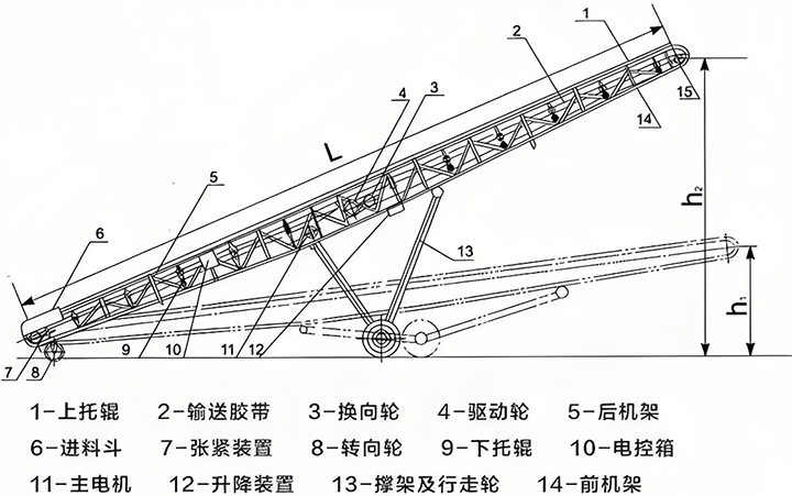 DY 型移動式皮帶輸送機由驅動、滾動、托輥、清掃、卸料、制動部分及罩殼、導料槽等附件構成,各部分包含多種類型部件,驅動裝置可左右裝并配不同參數電動滾筒。